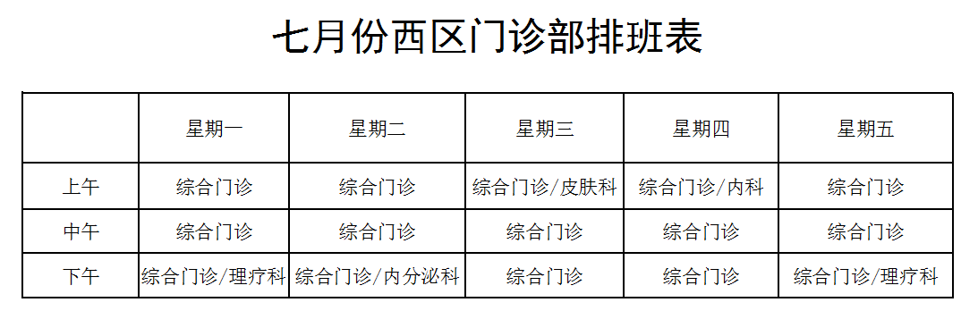 西区门诊部增设部分专科门诊的告示 为更好地服务广大师生,提高西区门诊部服务能力。自7月2日增设内科、内分泌科、皮肤科、理疗科门诊。具体时间参见排班表。西区门诊部2018年6月30日 返回列表 上一篇:下一篇:
