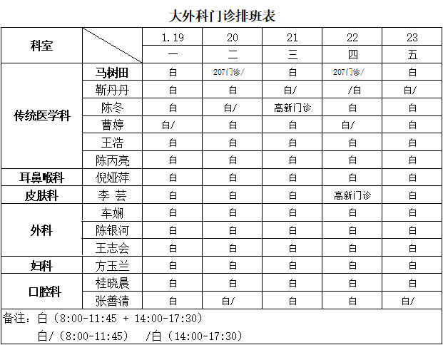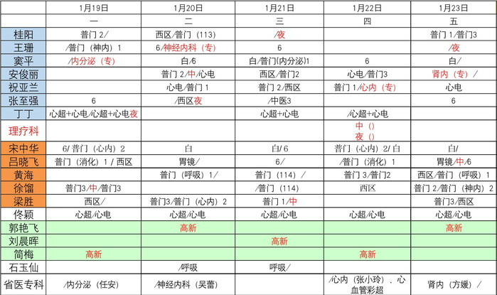 校医院内、外科门诊排班表(2026年1月19日—2026年1月23日)