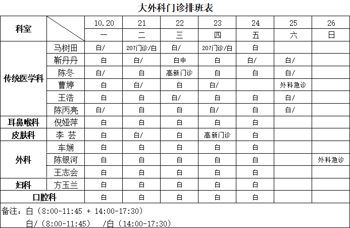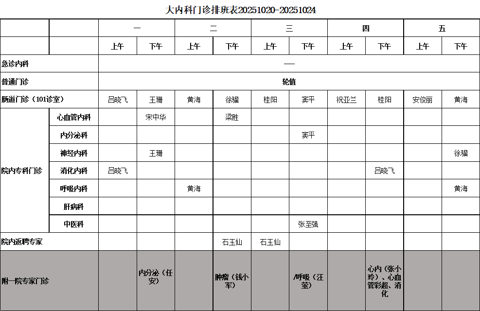 校医院内、外科门诊排班表(2025年10月20日—2025年10月26日)