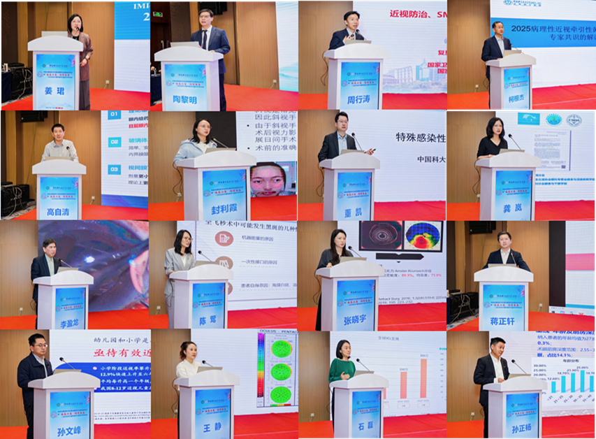 在近视防控与屈光手术专题,复旦大学附属眼耳鼻喉科医院周行涛教授带来《近视防治创新研究》的精彩报告,展示了团队在近视发生机制与干预策略上的最新突破;该院张晓宇副主任医师围绕亚临床期圆锥角膜的早期诊断进行阐述,以及龚岚教授基于指南共识,系统讲解了围术期干眼防控与眼表健康管理。温州医科大学附属眼视光医院姜珺教授解读了《2025 IMI——近视发生与进展控制干预措施解读》,分享了国际近视防控的最新共识;徐州市第一人民医院朱冉教授详细探讨了EVO+ICL V5的精细化质控管理及临床实践,安徽省第二人民医院石磊主任医师解读了《有晶状体眼后房型人工晶状体亚太专家共识和指南》,安徽医科大学第二附属医院王静主任医师重点介绍了Pentacam在屈光手术中的应用价值。